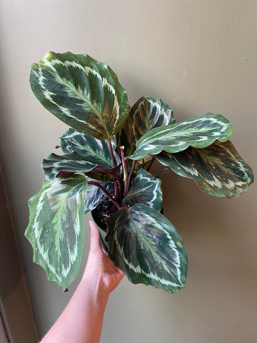 Bring vibrant pattern and graceful movement to your space with Calathea 'Medallion,' a striking foliage plant known for its large, round leaves featuring deep green tops with intricate, feather-like patterns and rich purple undersides. This tropical beauty adds a touch of drama and elegance to any room while naturally enhancing a calming atmosphere. Calathea 'Medallion' is also known for its unique habit of gently folding its leaves at night, giving it a dynamic, almost living presence in your home. Perfect for plant lovers seeking both visual interest and a soothing vibe.