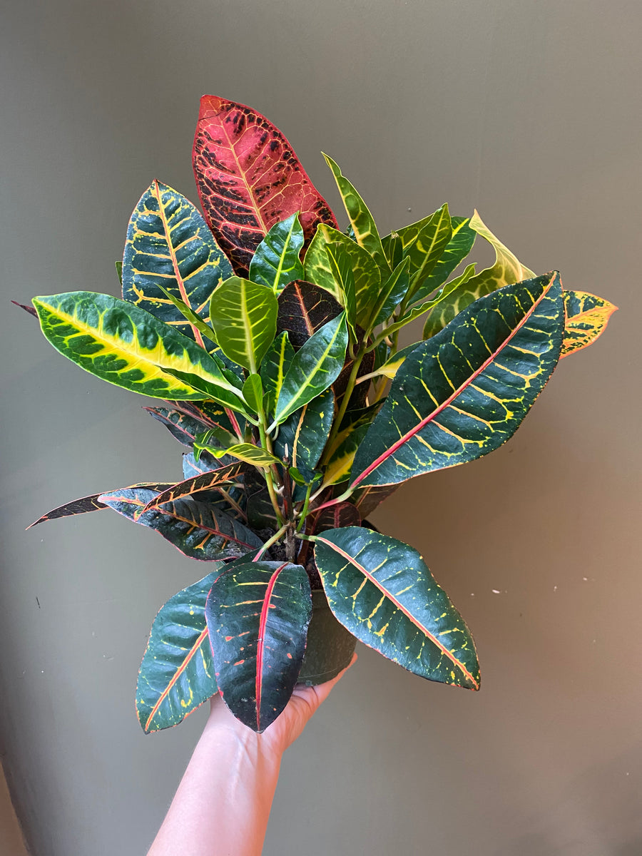 Bring bold color and tropical flair to your indoor space with the Croton Petra, a striking plant known for its glossy, thick leaves splashed with vibrant shades of red, orange, yellow, and green. Its compact, bushy form makes it perfect for tabletops, shelves, or bright corners where it can shine. Thriving in bright, indirect light, the Croton Petra is a low-maintenance statement piece that adds energy and warmth to any room. With its dramatic foliage, it’s a must-have for plant enthusiasts looking to make a colorful impression.